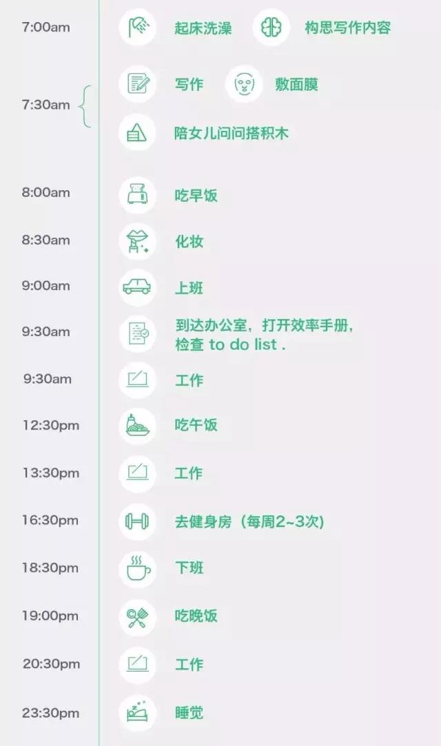 下面這張圖是印象筆記在采訪瀟灑姐王瀟時,她展示的日常作息,她出過五本書,是創(chuàng)業(yè)公司的創(chuàng)始人兼CEO,是活躍的大V,是家中的美貌妻子和溫柔媽媽,也是有好看馬甲線的健身達(dá)人,盡管做到了這么多事,她仍然每天精力充沛,做事效率超高!